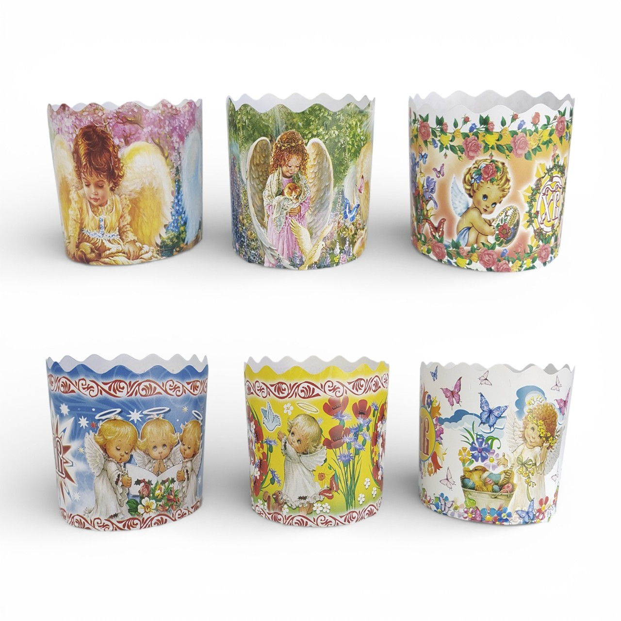 Паперові форми для пасок «Небесні дітки» — це зручне та естетичне рішення для випікання великодніх пасок і кексів. Виготовлені з міцного білого паперу з яскравими святковими малюнками янголів, вони надають випічці охайного та подарункового вигляду без додаткового пакування.